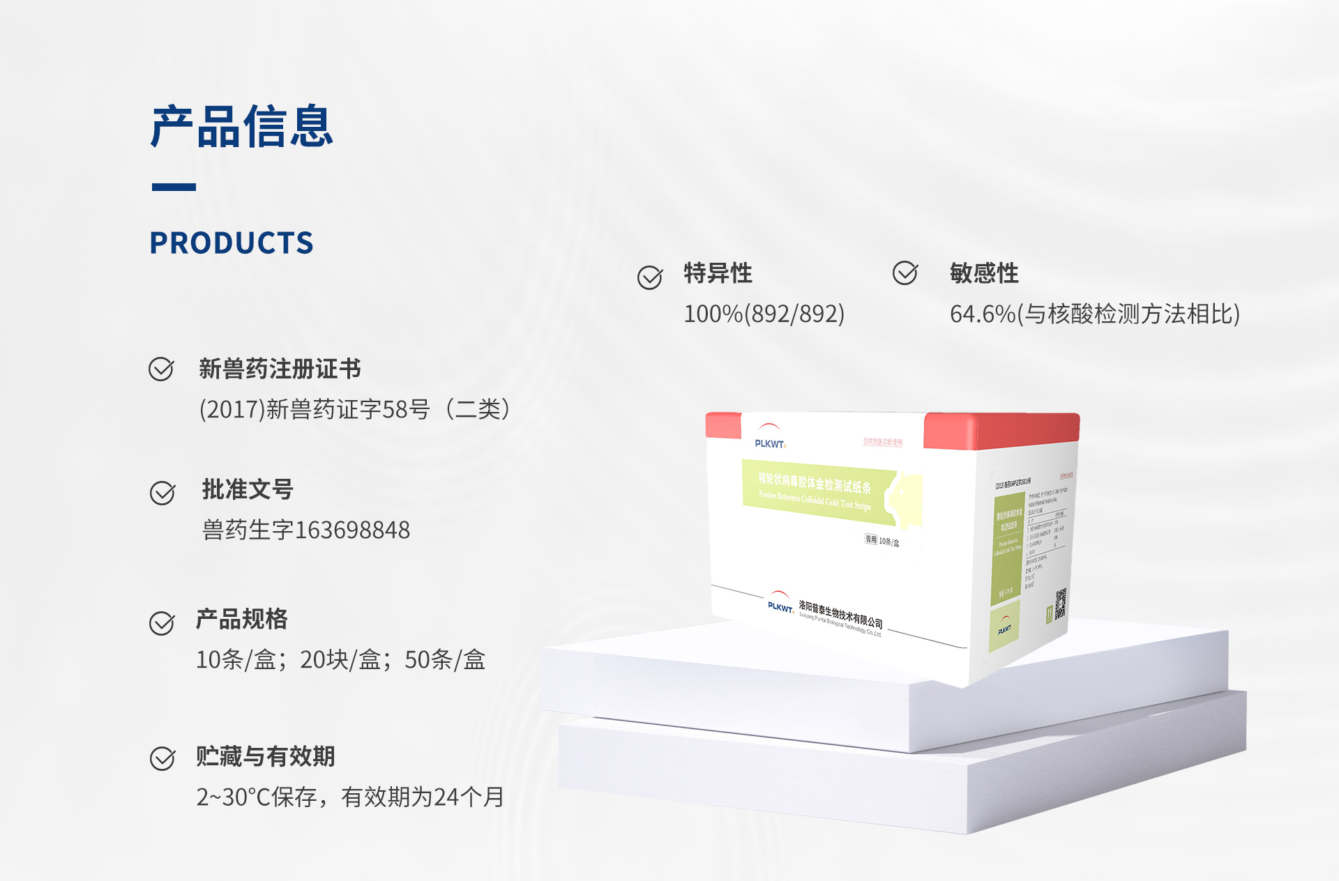 作用與用途:用于檢測豬肛拭子、糞便、小腸內容物和病毒培養物等樣品中的豬輪狀病毒抗原