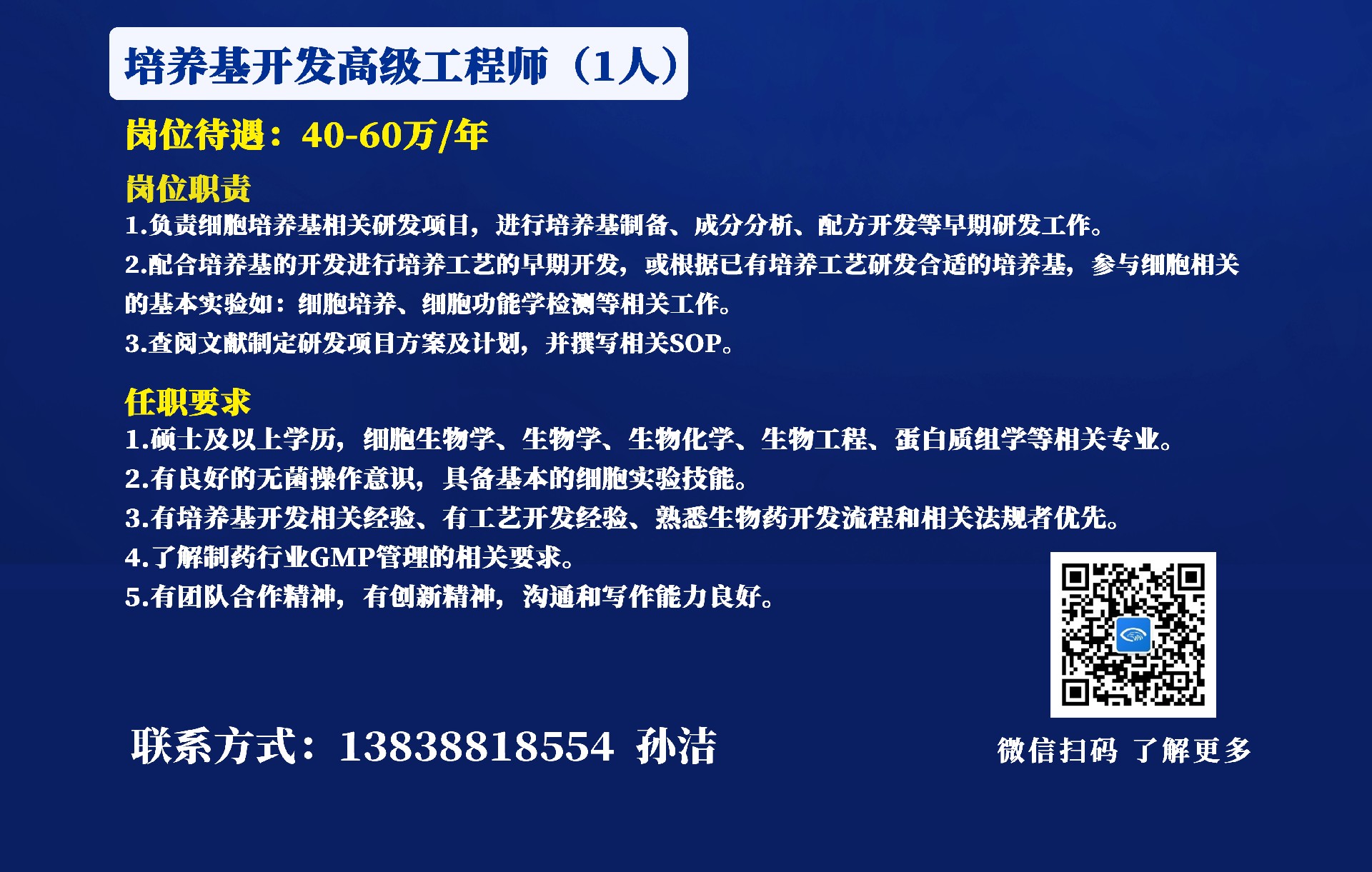 招聘生物材料銷(xiāo)售總監(jiān)、培養(yǎng)基開(kāi)發(fā)高級(jí)工程師